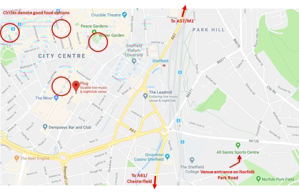 We'd suggest not bringing a car if you can help it, but if you need to, and struggle to find a space in the car park, you could try the streets to the north of the venue. See Parkopedia for options.