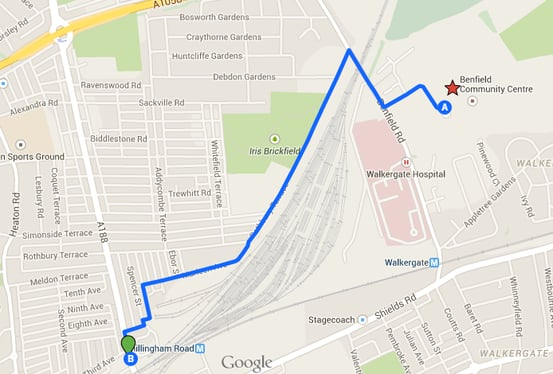 All matches will take place on the grass pitches at Benfield Sports Centre in Walker (Benfield Road, NE6 4NU). This is just a 20 minute walk from Chillingham Road, or 9 minutes from the Walkergate Metro Station. If you're coming by car there is plenty of parking. You can click on the images below to enlarge the maps.