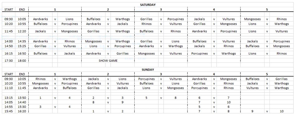 *Sunday morning sees all teams play three games in a row. This is to allow for a suitable lunch break and a reasonable finish time.