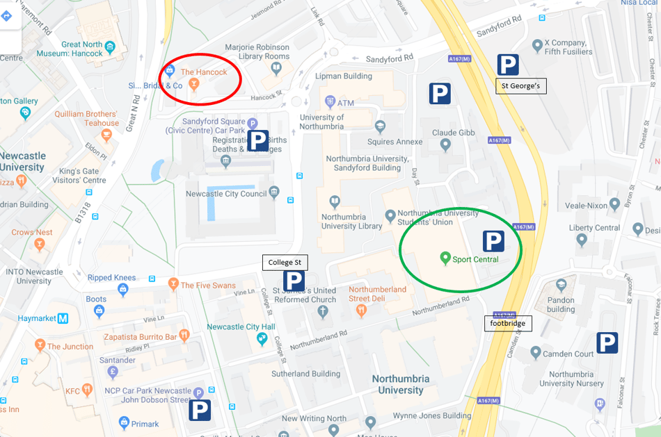 There are a number of car parks close to Sport Central. Please see the map below, and also the University campus map (link below map). You may be best trying St George's on Sandyford Road (£0.90 per hour), Sandyford Square (£1.40 per hour) or College St (£1.60 per hour). Sunday should be a flat rate of £3.00 for the day for these. You can also use the Northumbria University car parks close to Sport Central and Sandyford Road, though we're unsure of the cost at this point.